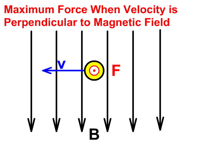 A force (F) on a moving charge (q) will be maximum at a velocity (v), perpendicular to Magnetic Field (B).