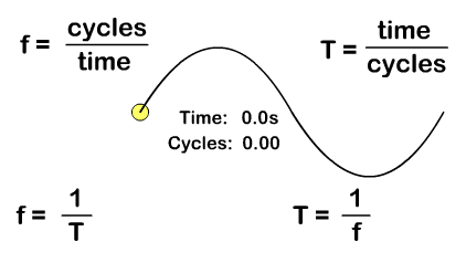 Frequency (f), with a standard measurement in Hertz, is how many repetitions occur per second.ย You can solve for frequency from the number of "wave" cycles and time with the formula: