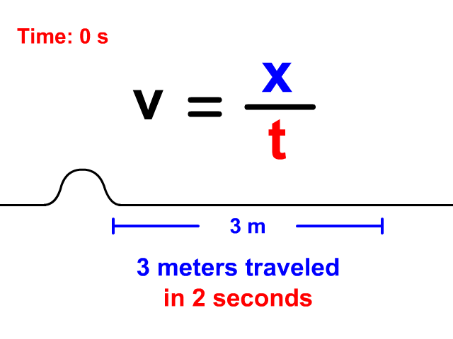 When a wave is treated like an object traveling a displacement in a time, v = x/t is the equation you will use.ย Notice in the animation that the wave travels 3 meters in a total of 2 seconds.ย The resulting velocity using v = x/t is 1.5 meters per second.