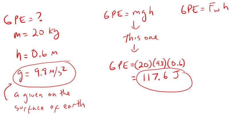 2. How much gravitational potential energy is in a 20 kg mass when 0.6 meters above the ground?