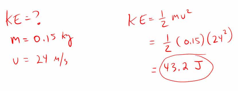 5.  How much kinetic energy does a 0.15 kg ball thrown at 24 m/s have?