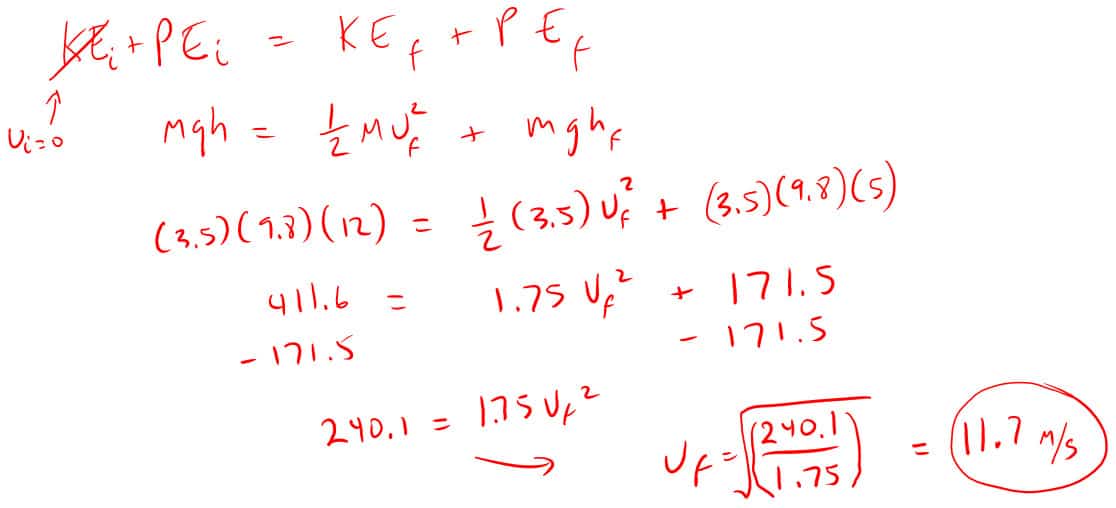 9.  A 3.5 kg ball fell from a height of 12 meters.  How fast is it traveling when its still 5 meters off the ground?