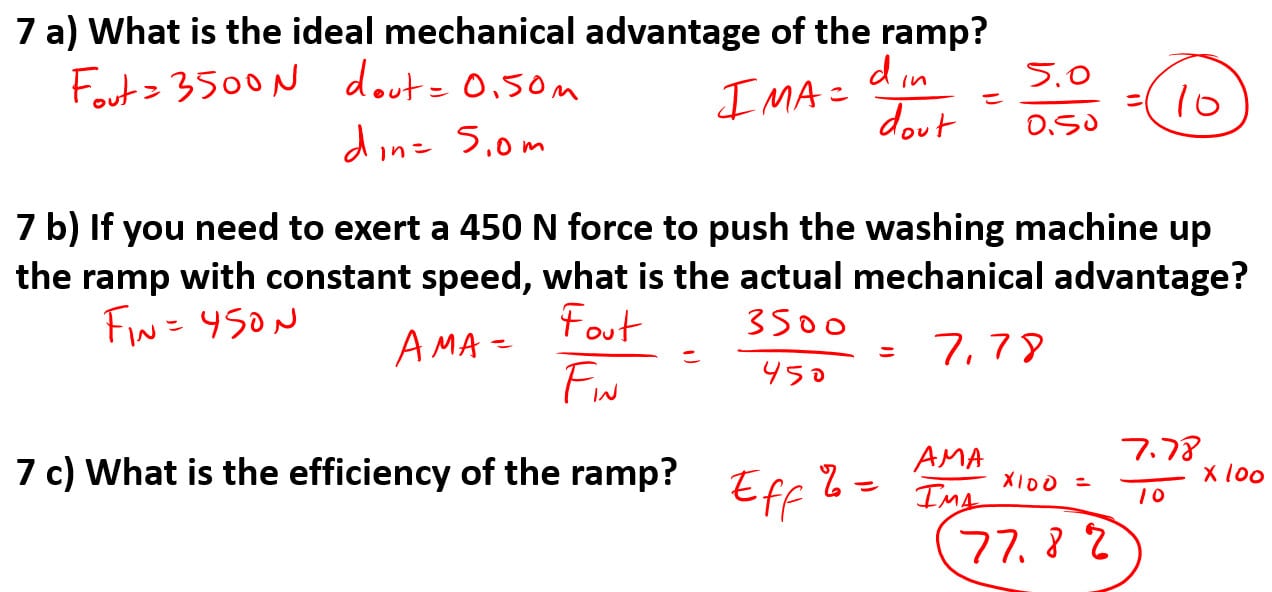 b) If you need to exert a 450 N force to push the washing machine up the ramp with constant speed, what is the actual mechanical advantage?